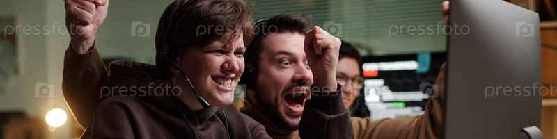Молодая женщина и молодой мужчина празднуют успех, работая в колл-центре мошенничества
