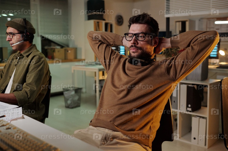 Молодой взрослый мужчина отдыхает за рабочим столом в офисе мошеннического колл-центра ночью
