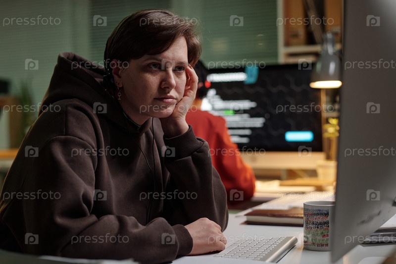 Молодая женщина, работающая на компьютере в мошенническом колл-центре ночью