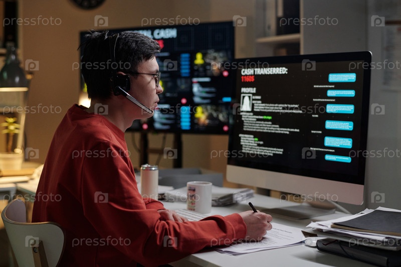 Молодой человек работает в мошенническом колл-центре, наблюдая за экраном компьютера