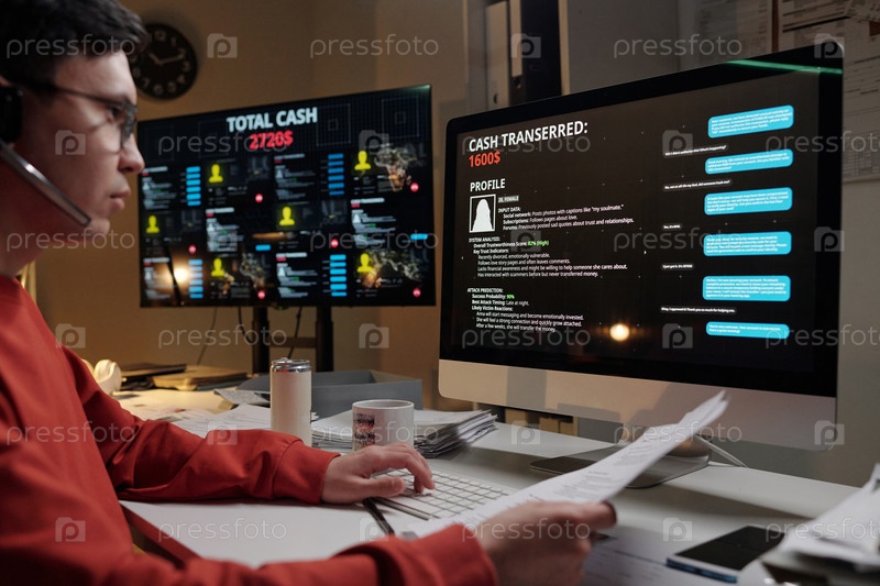 Молодой взрослый мужчина просматривает данные о транзакциях, управляя мошенническим колл-центром