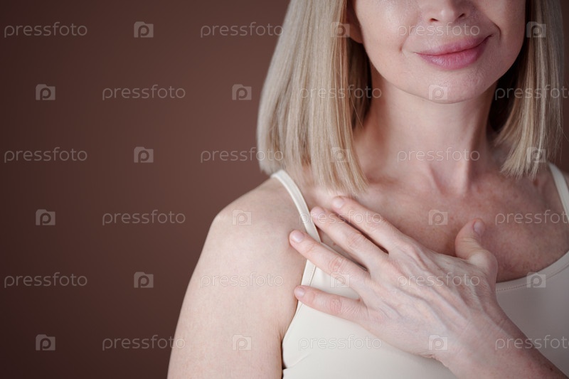 Улыбающаяся женщина с рукой, касающейся ключицы