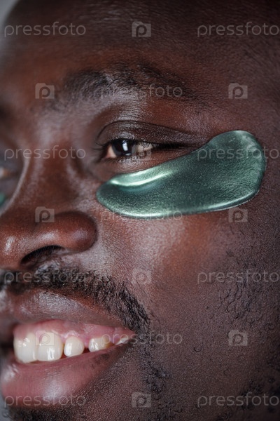 Улыбающийся чернокожий мужчина, носящий подглазные пластыри