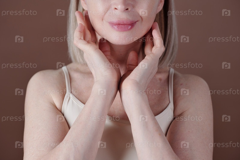 Пожилая женщина прикасается к лицу руками