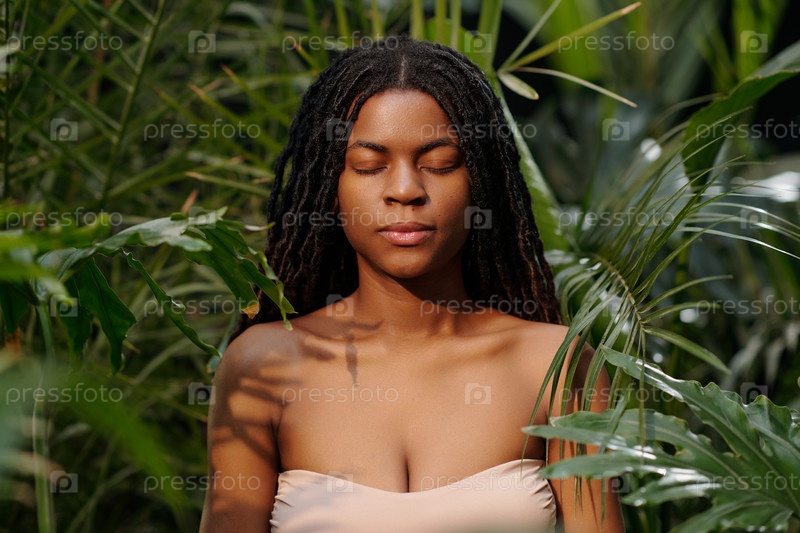 Медитирующая молодая женщина, окруженная зеленью