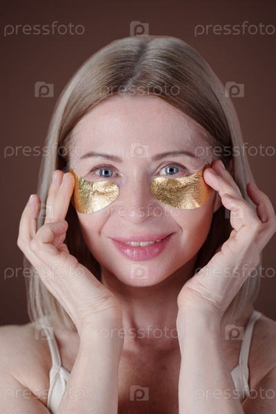 Портрет пожилой женщины, наносящей золотые маски для глаз