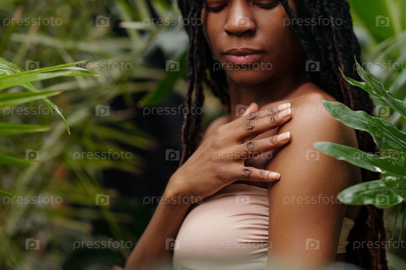 Девушка, касающаяся плеча среди зелени