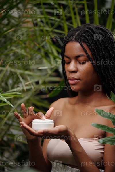 Расслабленная женщина держит крем для ухода за кожей в природе