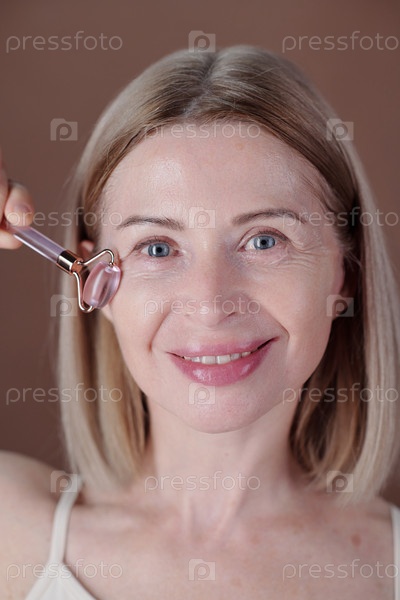 Портрет улыбающейся женщины, использующей инструмент для ролика лица