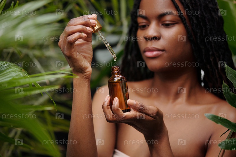 Девушка, применяющая масляную сыворотку в зеленой обстановке