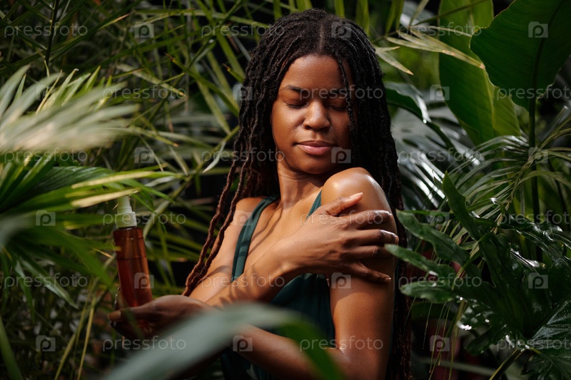 Девушка, которая держит лосьон для прикосновения к плечу в пышной зелени