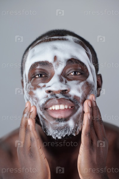 Портрет чернокожего человека, наносившего пену для очистки лица