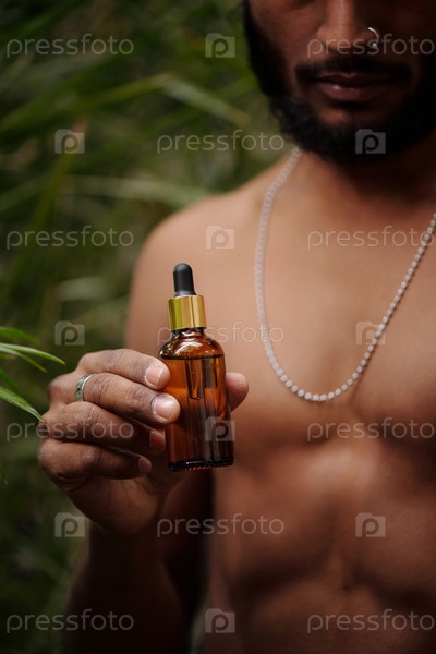 Вертикаль мужчины, показывающего бутылку со стеклянной капельницей