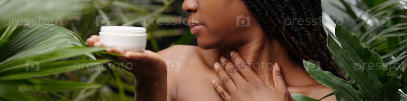 Девушка держит крем для ухода за кожей против зеленых листьев