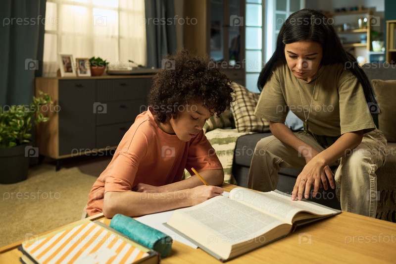 Военная женщина помогает мальчику-претенденту изучать домашнее задание дома