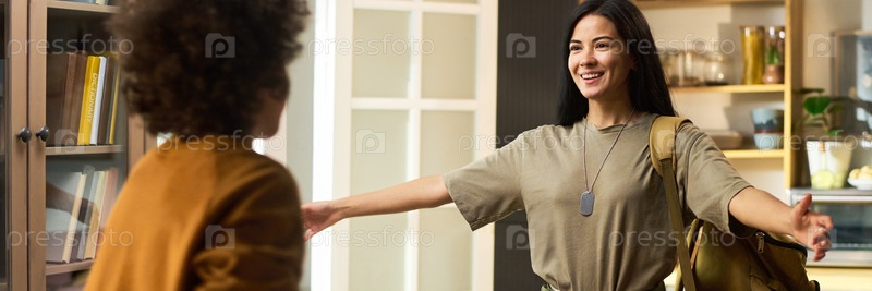 Молодая взрослая военная женщина, прибывающая домой, встречает ребенка с объятиями