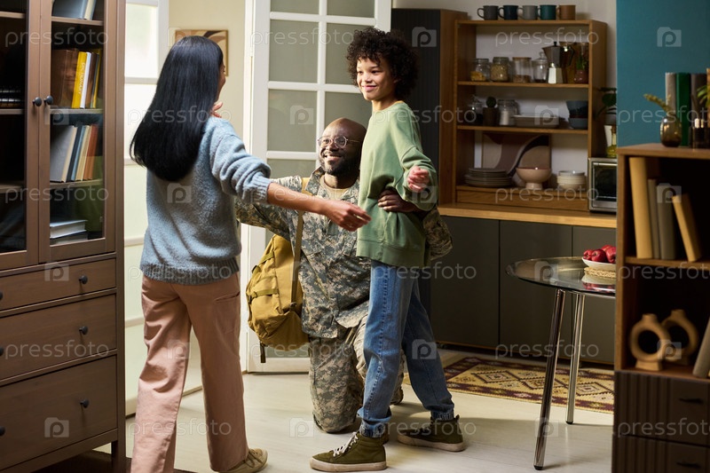 Чернокожий мужчина средних лет в военной форме обнимает членов семьи дома