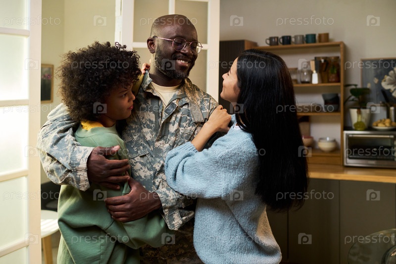 Военный мужчина обнимает членов семьи дома, улыбаясь американцам