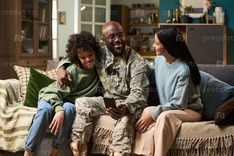 Чернокожий мужчина средних лет в военной форме делится моментом с семьей внутри