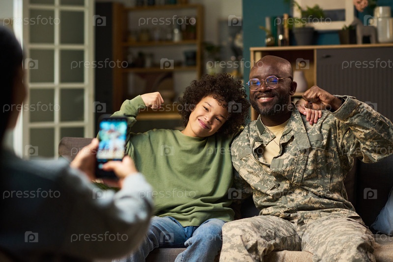Американский военный мужчина и ребенок улыбаются и позируют для фотографии
