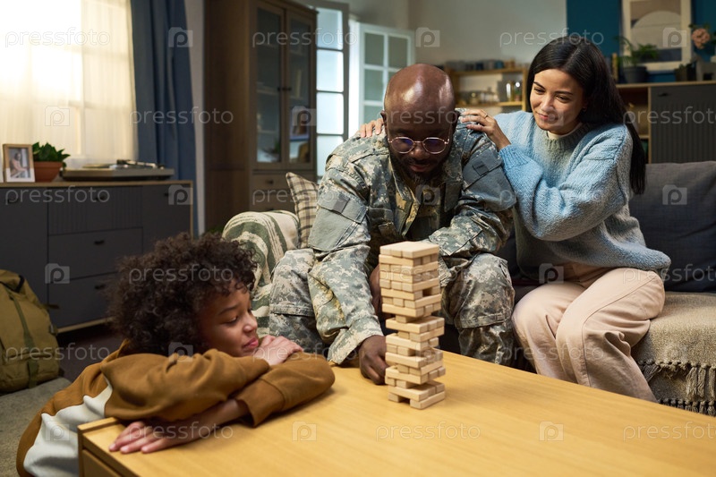 Чернокожий мужчина средних лет в военной форме играет в игру с семьей дома