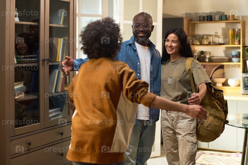 Мультиэтнический военный мужчина и семья воссоединяются и улыбаются дома