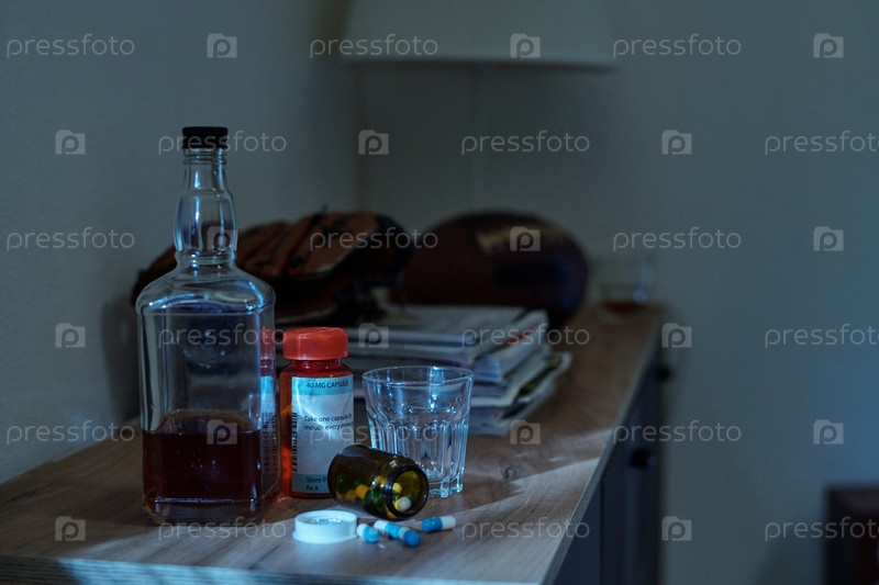 Бутылка алкоголя и рецептурные таблетки сидят за столом