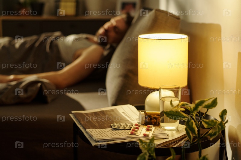 Мужчина, отдыхающий в постели с лекарствами и водой поблизости