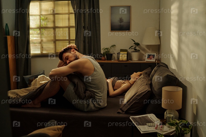 Молодой человек сидит на кровати Чувство стресса во время семейного конфликта