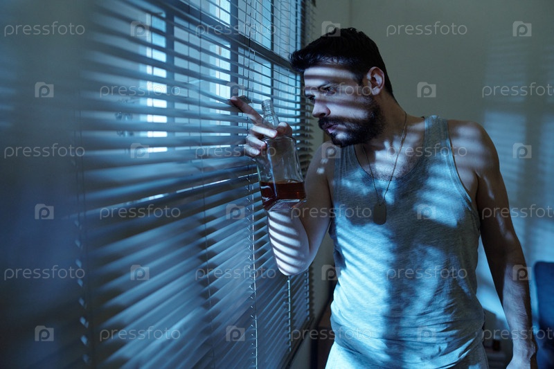 Мужчина средних лет пьет в одиночестве, глядя через жалюзи