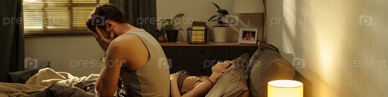 Молодой взрослый мужчина сидит на кровати и борется с эмоциональным дистрессом