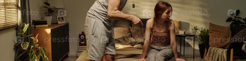 Мужчина среднего возраста показывает агрессивно на молодую женщину, сидящую в отчаянии