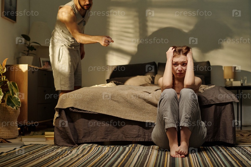 Молодая женщина сидит в отчаянии, мужчина жестикулирует агрессивно
