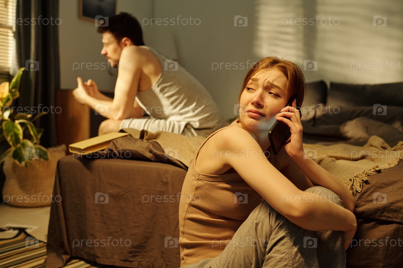 Молодая женщина плачет по телефону, пока мужчина спорит