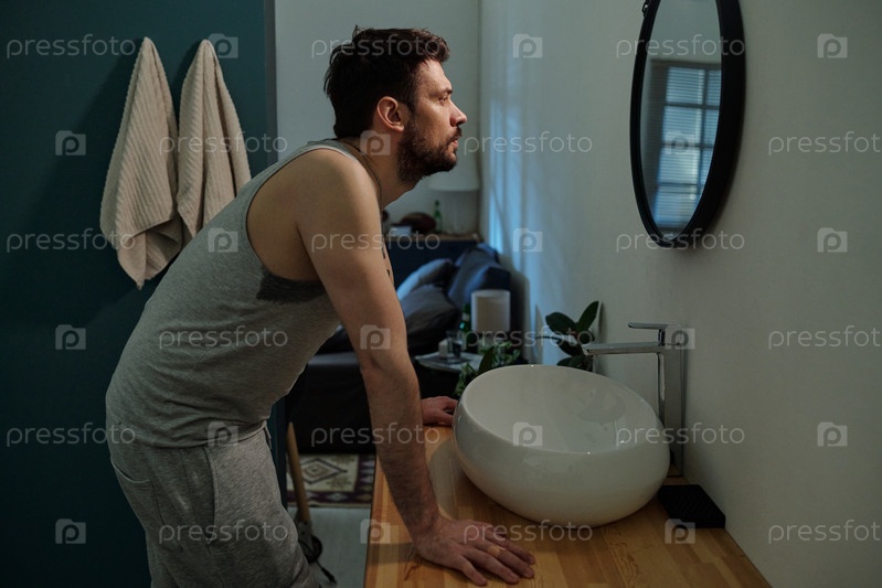 Мужчина, смотрящий в зеркало и размышляющий о семейных проблемах