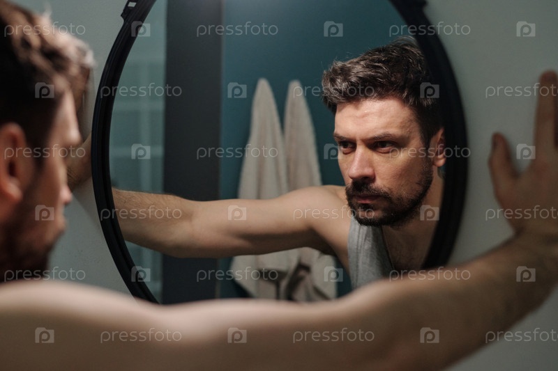 Молодой человек размышляет о семейных проблемах в зеркале ванной