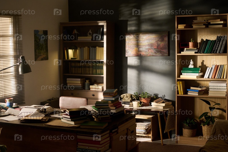 Солнечный свет освещает уютный домашний офис с книжными полками и наложенными документами