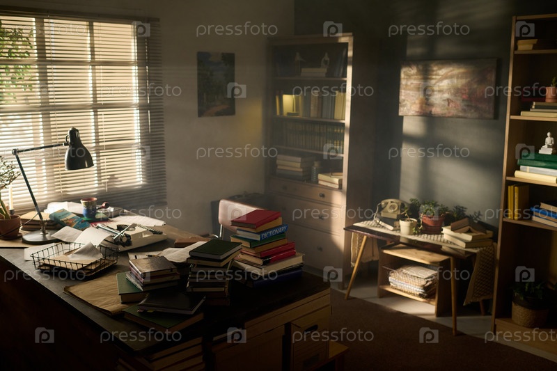 Солнечный свет освещает уютный интерьер домашнего офиса с книгами и комнатными растениями