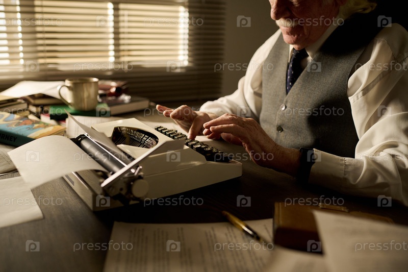 Старший человек печатает на пишущей машинке в офисе днем