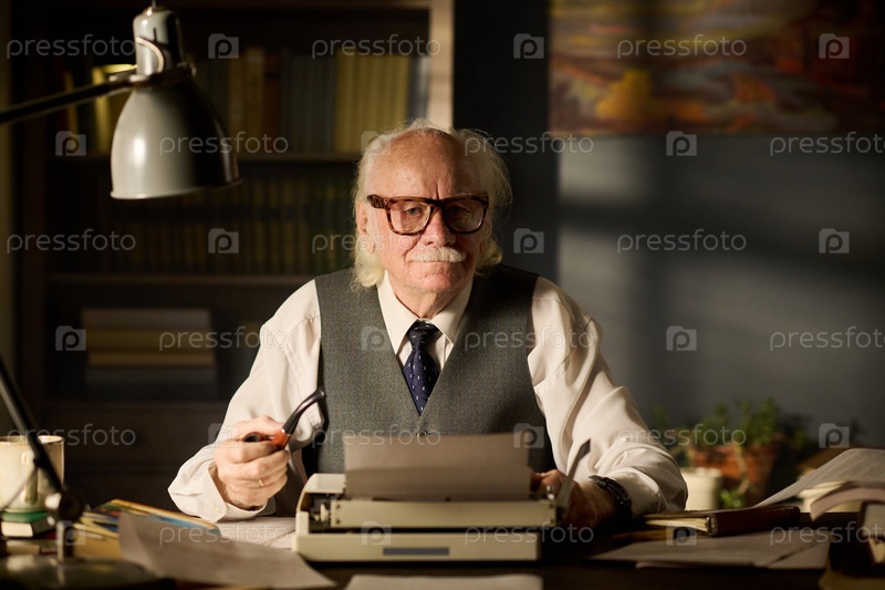 Портрет старшего человека, сидящего за рабочим столом с помощью пишущей машины в помещении