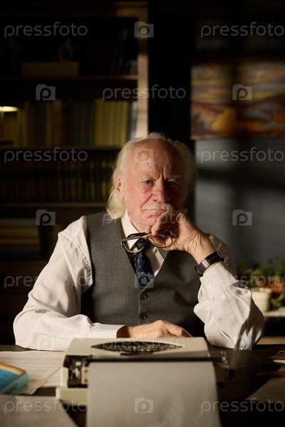 Портрет старшего человека, сидящего за рабочим столом и размышляющего в офисе библиотеки