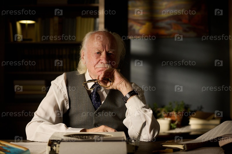 Портрет пожилого мужчины, отражающего в то время как он держит очки за столом внутри
