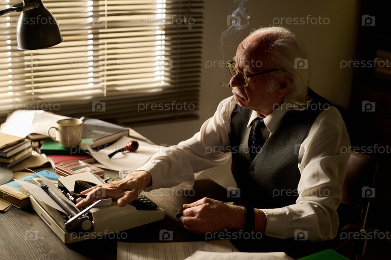 Старший человек пишет на печатной машинке в офисе с концентрированным выражением