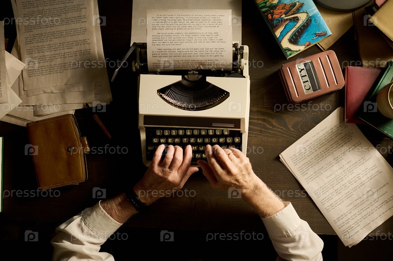Старший человек печатает рукопись на винтажной машинке в деревянном столе