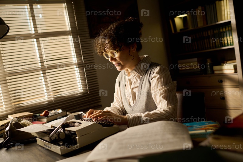 Молодая взрослая женщина печатает рукопись на пишущей машине в домашнем офисе
