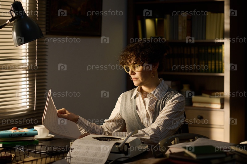 Молодая взрослая женщина читает документы, работая за столом в помещении
