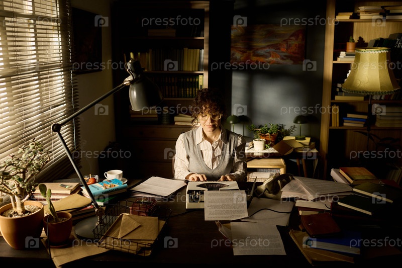 Женщина средних лет пишет рукопись с помощью печатной машины в домашнем офисе