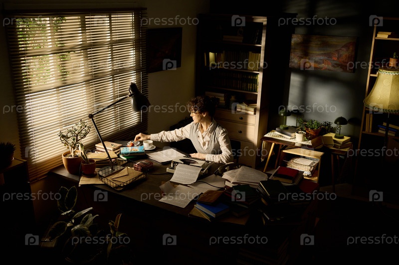Молодая взрослая женщина, работающая за рабочим столом в окружении бумаг и книг