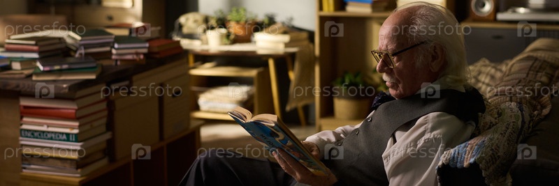 Пожилой мужчина читает книгу, сидя внутри в уютной гостиной