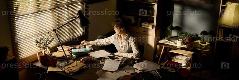 Женщина среднего возраста, работающая за столом в домашнем офисе днём